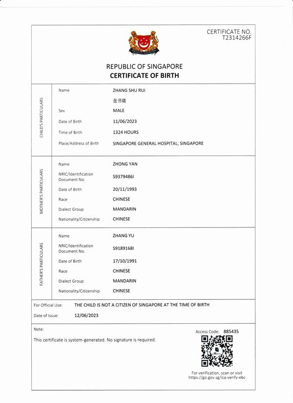 咸陽翻譯/政府指定咸陽翻譯/公安/新加坡出生證明翻譯模板